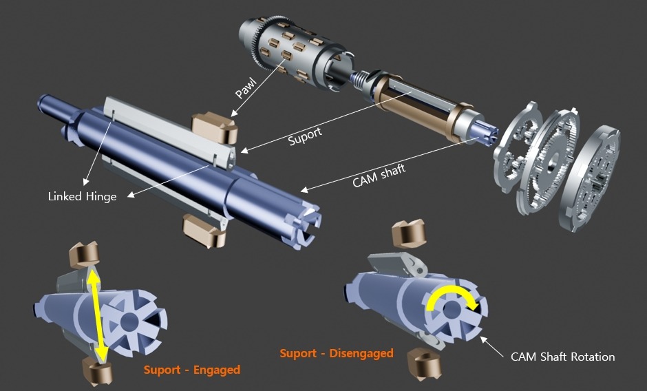 When the CAM shaft and Support are aligned in a straight line, the pawl is fully supported and protrudes from the main shaft.